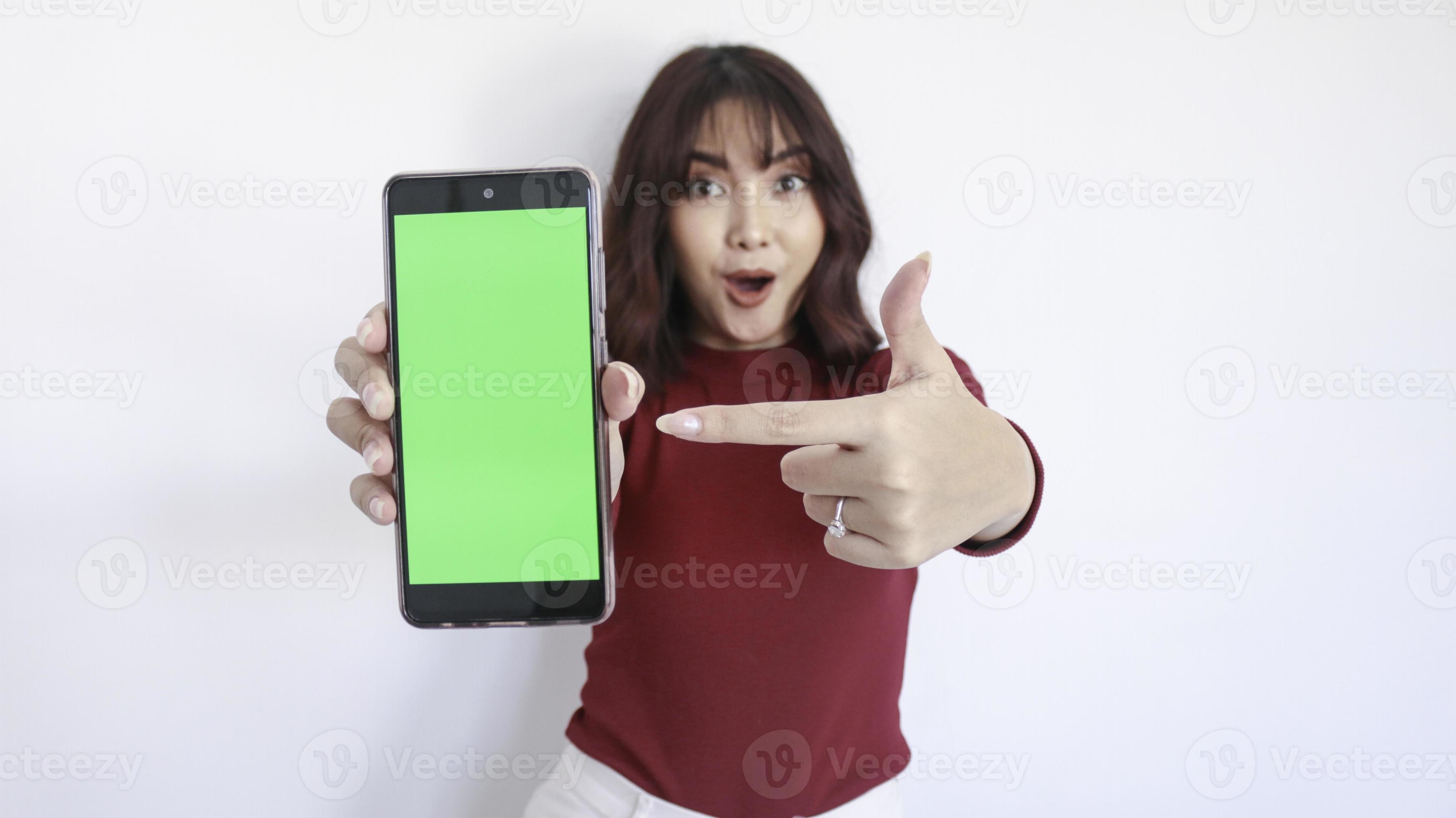 Wow And Shock Asian Beautiful Girl Point On Green Screen Phone With Blurry Background On Face In White 6437157 Stock Photo At Vecteezy